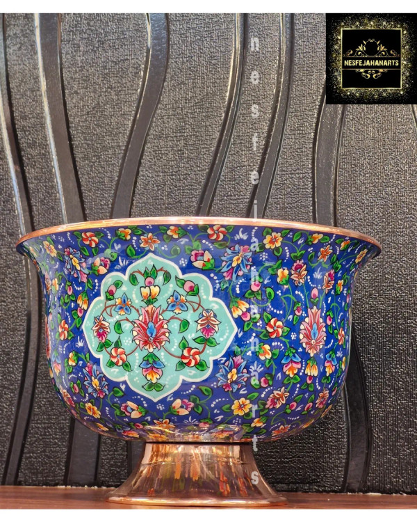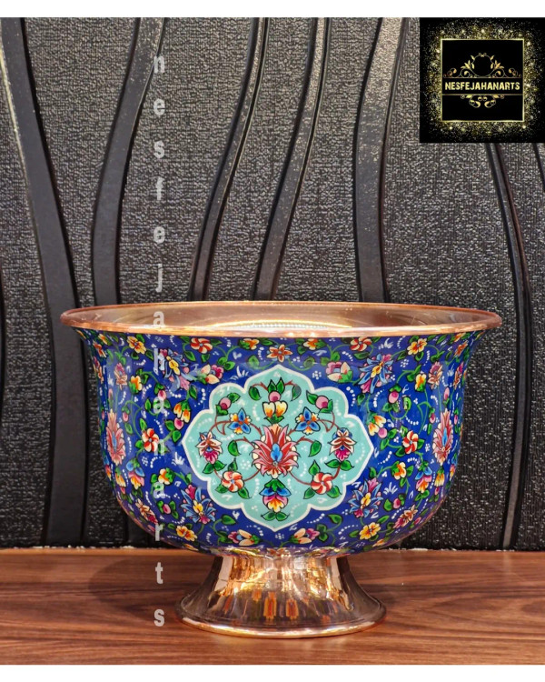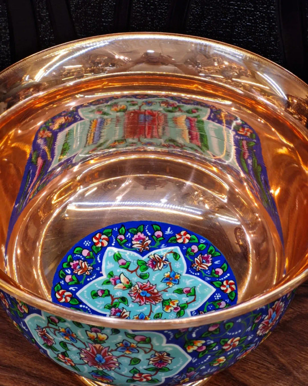 "رنگها و نقوشی که حرفی برای گفتن دارند. ظرف مسی میناکاری، اثری ماندگار از عشق و خلاقیت هنرمندان ایرانی. با این هنر زیبا، گوشهای از تاریخ را به خانه بیاورید. "