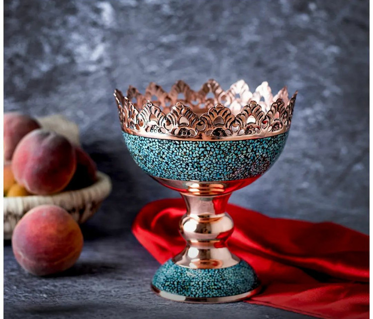 درخشش فیروزهی نیشابور بر پیکرهای از مس، زیبایی صدچندان به «آجیلخوری فیروزهکوب» آقاجانی بخشیده است. محصولی چشمنواز که زینتبخش خانهی شما است. شبکهبری ظریف و قلمزنی استادانه «آجیلخوری فیروزهکوب» را به ظرفی متفاوت جهت سرو انواع آجیل و تنقلات تبدیل کرده است.