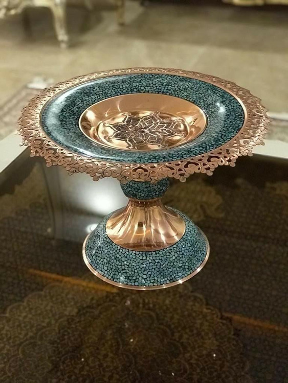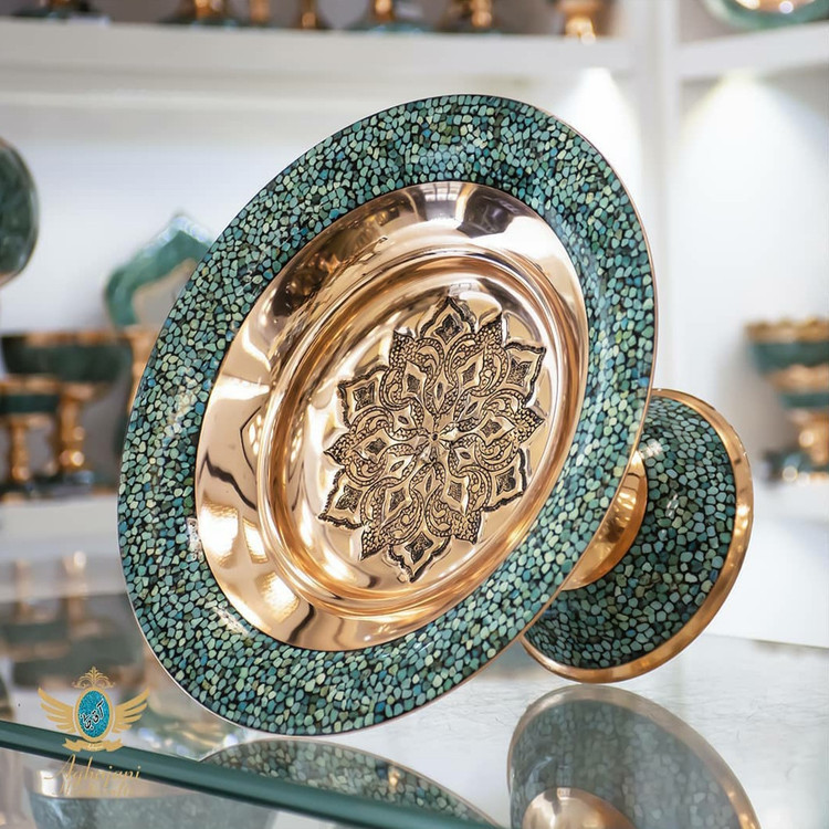 «شیرینیخوری فیروزهکوب» با زیرساختی از مس درخشان و چیدمان خوش نقش سنگهای فیروزه به صورت نواری دایرهوار بر لبهی خارجی آن شکوه هنر اصیل ایرانی را به تصویر میکشد. قلمزنی زیبا که بر سطح دایرهای شکل داخل «شیرینیخوری فیروزهکوب» انجام گرفته بر چشمنوازی این محصول افزوده است.