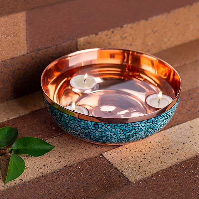 «کاسه ساده فیروزهکوب» آقاجانی با ارتفاع ۷.۵ سانتیمتر و قطر ۲۰ سانتیمتر به نحوی متفاوت زیبایی همنشینی مس و فیروزه را به رخ میکشد. محال است با دیدن «کاسه ساده فیروزهکوب» آقاجانی به یاد این مصرع از شعر سهراب سپهری نیفتید: «نور در کاسهی مس چه نوازشها میریزد …». ظرفی که معنای سادگی در زیبایی است را به خوبی به تصویر میکشد. یک نوار نسبتاً ضخیم از سنگهای فیروزه، دورتا دور کاسهی مسی را پوشش داده و آن را از ظرفی در سبک مطلقاً مدرن و مطلقاً سنتی خارج کرده است. از «کاسه ساده فیروزهکوب» میتوانید برای سرو تنقلات، آجیل، شکلات و … استفاده کنید. از سوی دیگر این محصول دکوراتیو میتواند زینتبخش دکوراسیون منزل یا آتلیهی شما باشد.