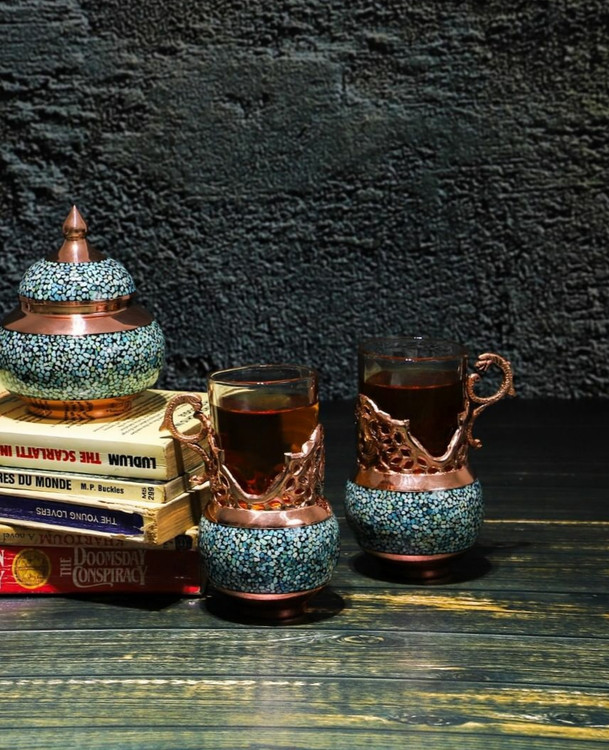 لذت نوشیدن چای خوشرنگ ایرانی در «گالش فیروزهکوب» آقاجانی، فراموشنشدنی است. ارتفاع «گالش فیروزهکوب» آقاجانی ۹.۵ سانتیمتر و قطر آن ۵.۵ سانتیمتر است. تلفیق بینظیر مس و فیروزه همراه با قلمزنی استادانه و شبکهبری ظریف، «گالش فیروزهکوب» آقاجانی را به محصولی زیبا، چشمنواز و البته کاربردی تبدیل کرده است. برای یک پذیرایی خاص و اشرافی میتوانید از «گالش فیروزهکوب» آقاجانی استفاده کنید. زیبایی این گالش، مهمانان شما را شگفتزده خواهد کرد. با سرو چای یا قهوه در «گالش فیروزهکوب» میتوانید حس سفر در تاریخ کهن ایران زمین را تجربه خواهید کرد. «گالش فیروزه کوبی برند آقاجانی» از محصولات خاص و درخشان صنایعدستی آقاجانی است. هدیهای ماندگار و بی مانند که با اصالت ایرانی گره خورده است.