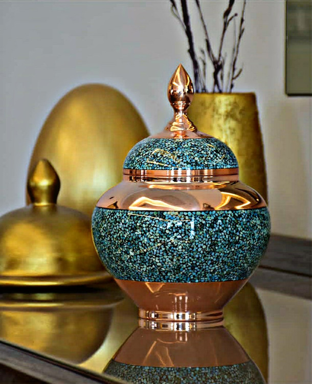 کارگاه تولید صنایع دستی آقاجانی یکی از پیشگامان این هنر و ترکیب مس و فیروزه کوبی است.