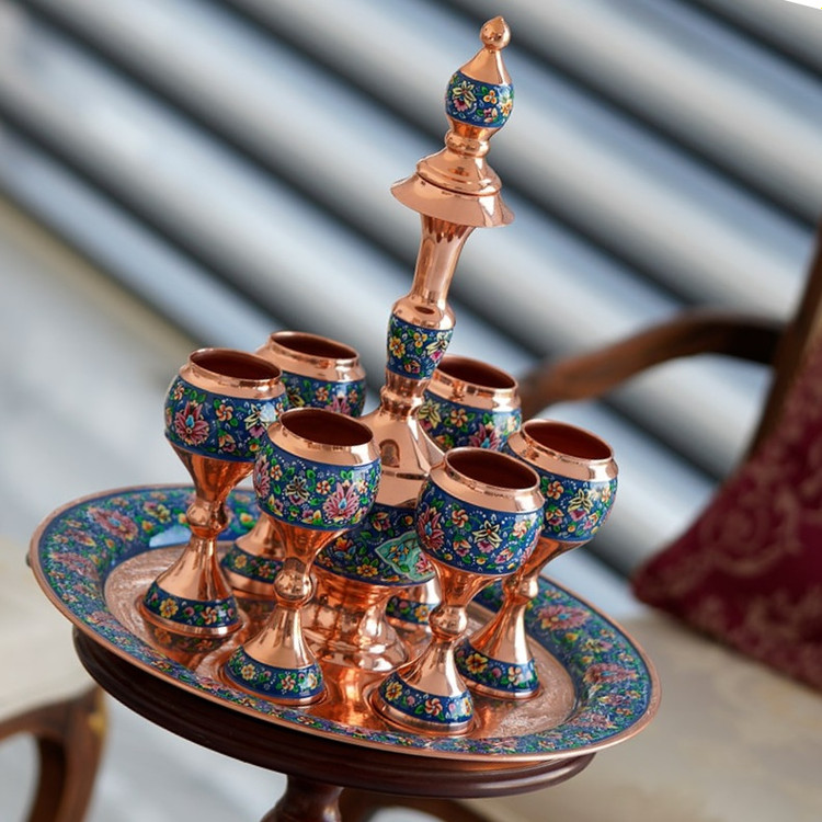 «سرویس شربتخوری مس و پرداز» آقاجانی مجموعهای درخشان از تبلور هنر مس و پرداز است. یک ست بسیار چشمنواز، لوکس و دکوراتیو که با ترکیب رنگهای مختلف بر روی پس زمینهای سورمهای رنگ میدرخشد.
