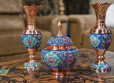 ۲- هنرمندان نگارگر روی ظروف مسی طرحها و نقوس اسلیمی، ختایی و … را نقاشی و رنگآمیزی میکنند.