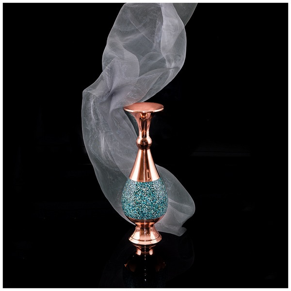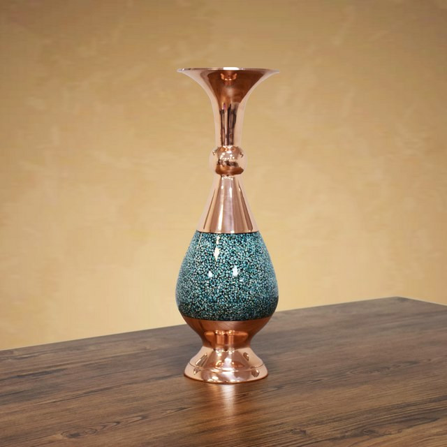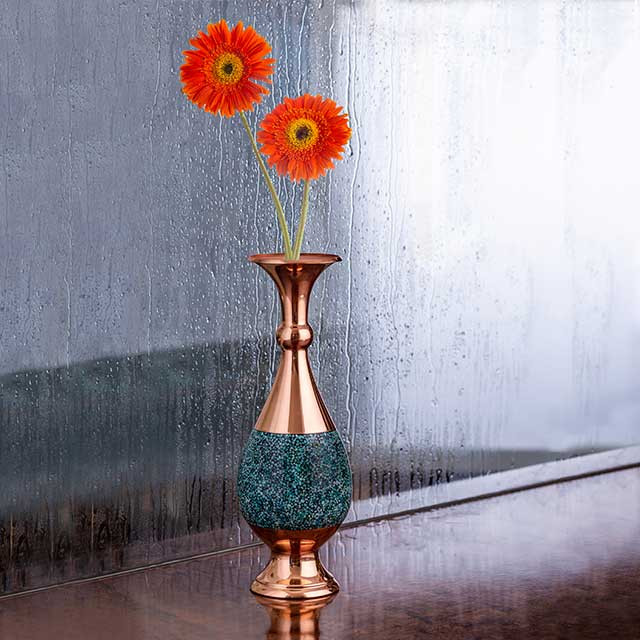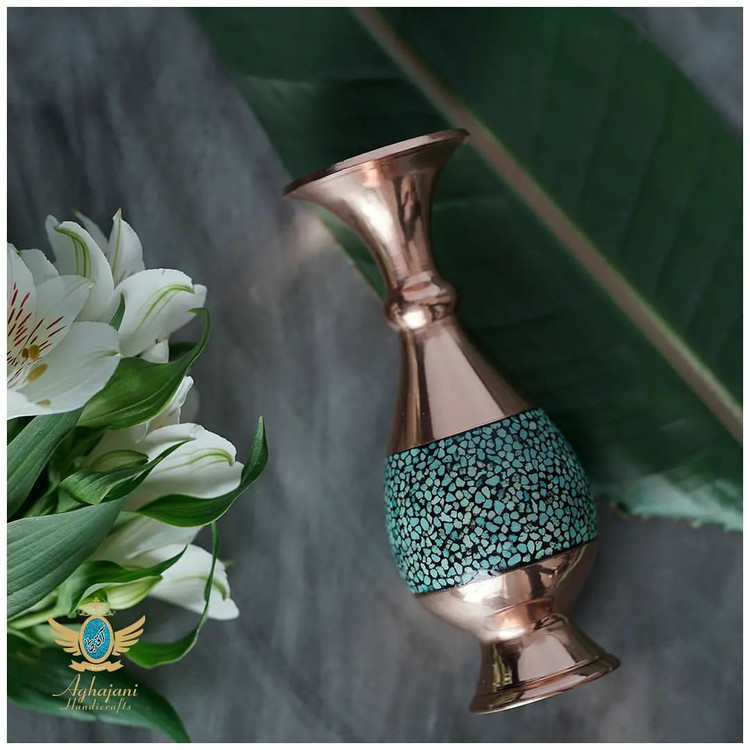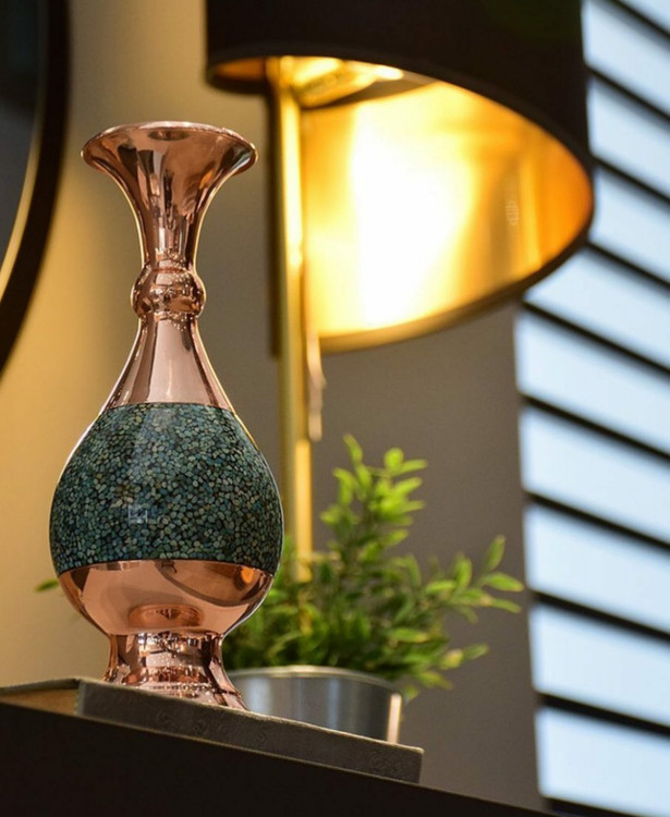 «گلدان صراحی » آقاجانی با چیدمان بینظیر سنگهای فیروزه بر سطح درخشان مس، سرشار از حس خوب زندگی است.