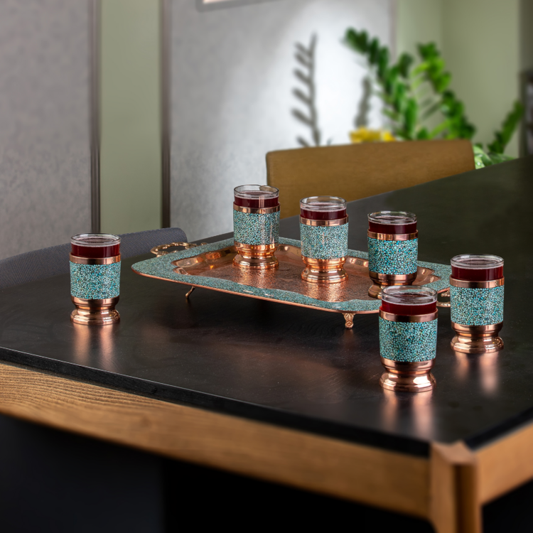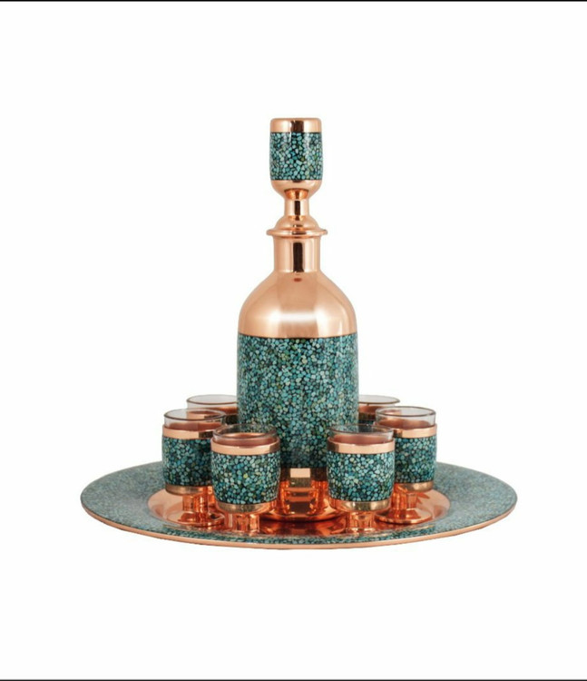 سرویس شربتخوری مینیاتوری نفیس تافتهای جدابافته از ترکیب مس و سنگهای فیروزه است که در قالب محصولی کاربردی و مدرن طراحی و ساخته شده است. این سرویس از جدیدترین محصولات تولید شده توسط برند آقاجانی است که از خلاقیت و هنر استادکاران خوشقریحه اصفهانی سرچشمه گرفته، سپس با ترکیب مواد خام طبیعی در قالب یک ست کامل شربتخوری مدرن تبلور یافته است.