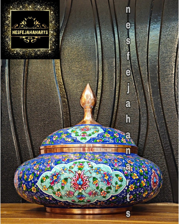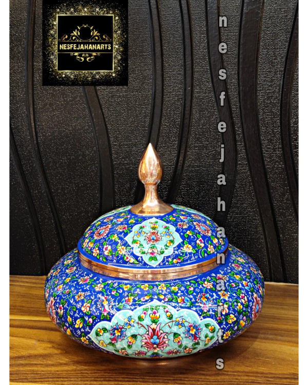 این ظرف دارای دو قسمت شامل بدنهی مدور و درب گنبدی شکل میباشد. بر روی بدنه و درب ظرف، نقوش اسلیمی و ختایی در رنگهای سبز، زرد، صورتی، قهوهای، مشکی و سفید بر زمینه آبی لاجوردی، نقاشی شده است.