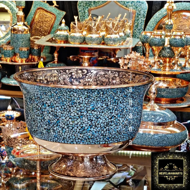 ✨️"" کاسه لاله قلمزنی فیروزه کوبی ""✨️ یکی از آثار هنری اصیل ایرانی است که ترکیبی از هنر قلمزنی و فیروزهکوبی را به نمایش میگذارد. این کاسهها معمولاً از مس ساخته شدهاند و با فیروزههای طبیعی تزئین شدهاند. پایه کاسهها اغلب دارای نقشهای قلمزنی شده است که زیبایی خاصی به آنها میبخشد✔️